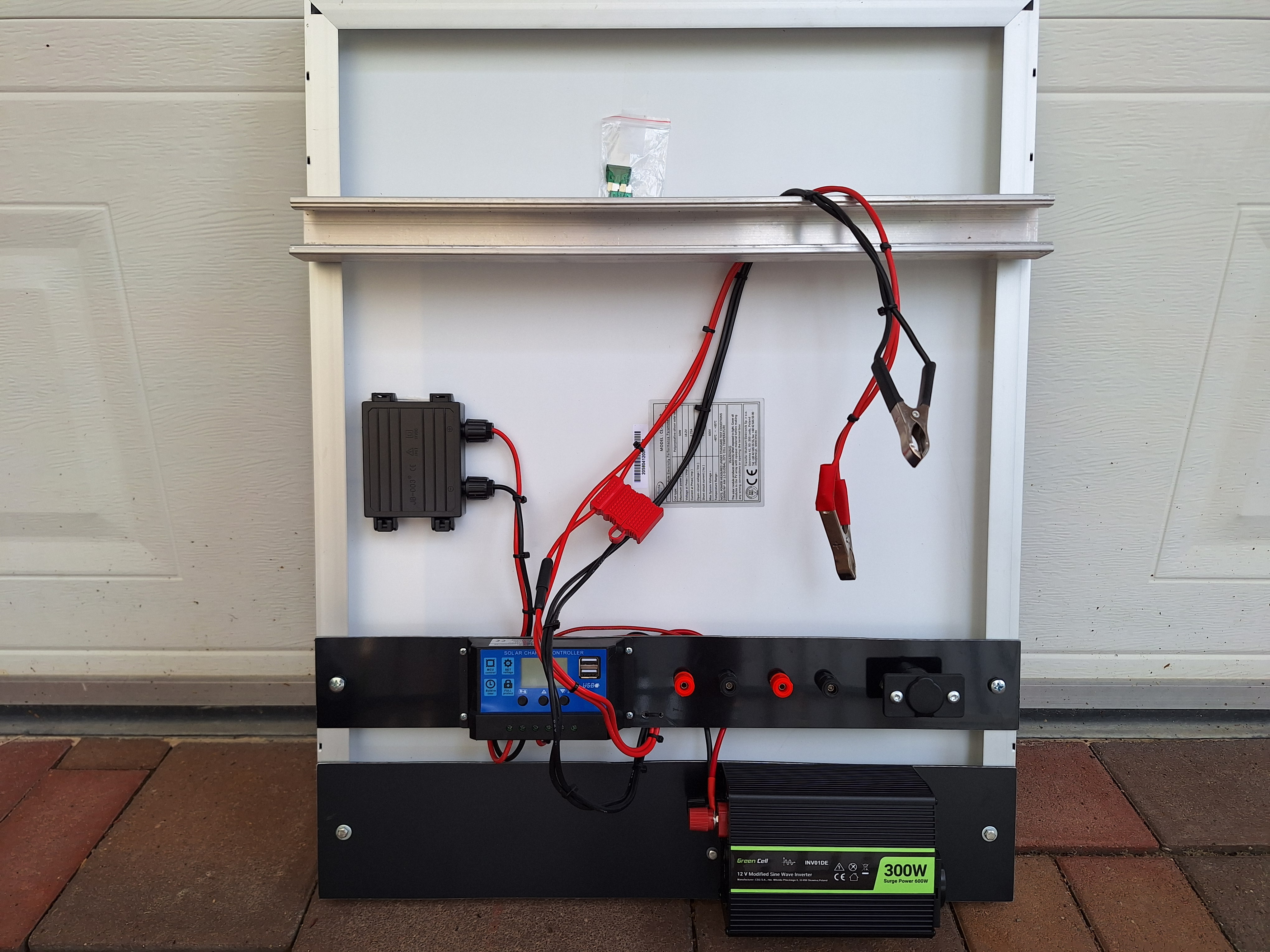 Az akkumulátoros energiaellátást napelemes töltésszabályozós rendszer támogatta. Felépítése: 50W-os polykristályos napelemtábla, MM2109PWM típusú töltésvezérlővel. Mindez egy lapos tartóra szerelve, amelyen 2-2 csavaros banánhüvely és autós csatlakozó is helyet kapott. Sőt a töltésvezérlőnek még két USB portja is van az esetleges telefontöltést kiszolgálni. A tápellátó rendszer idén kiegészült egy 12VDC/230VAC 300W inverterrel, hogy a laptop is gond nélkül üzemelhessen.
