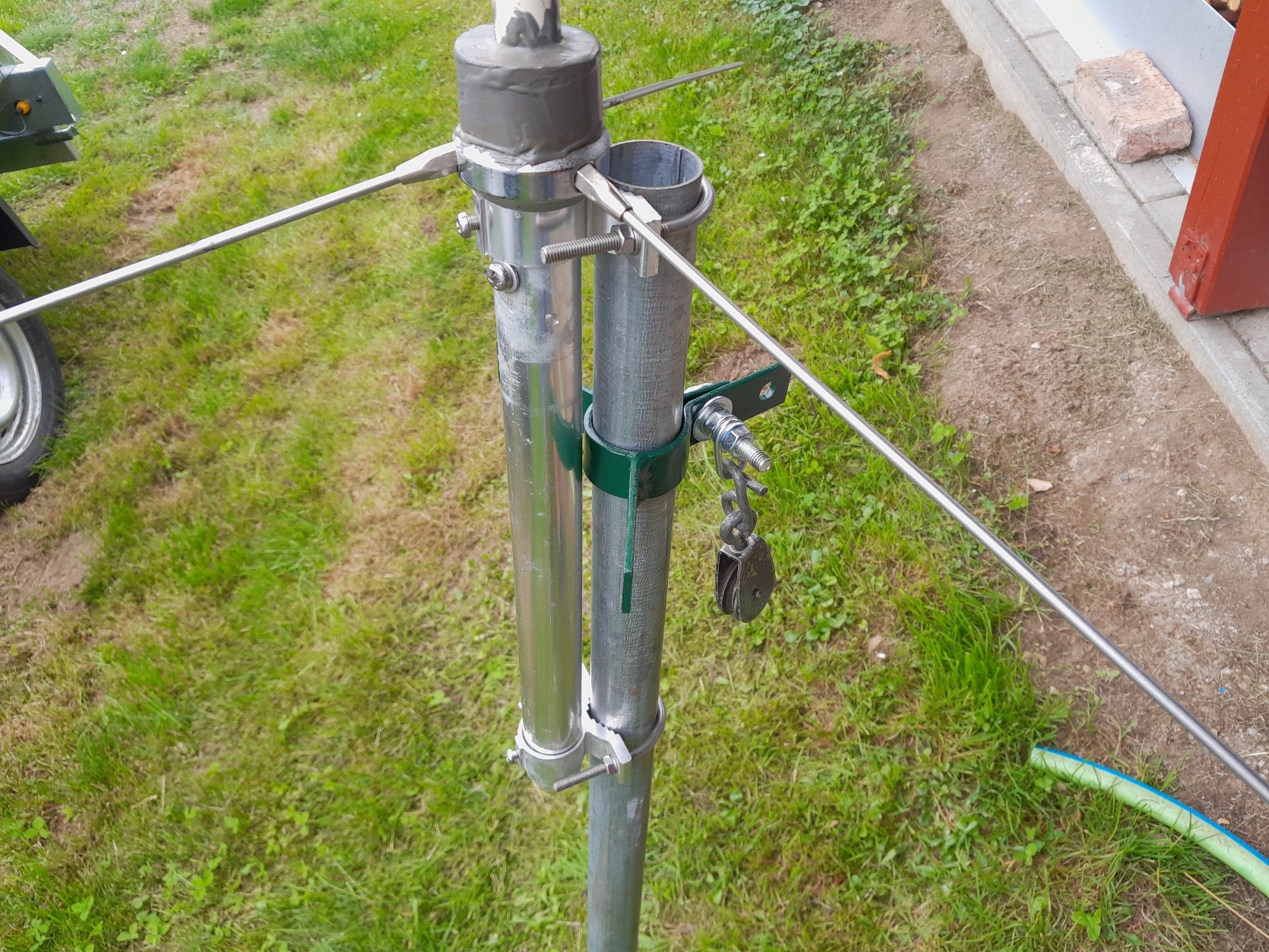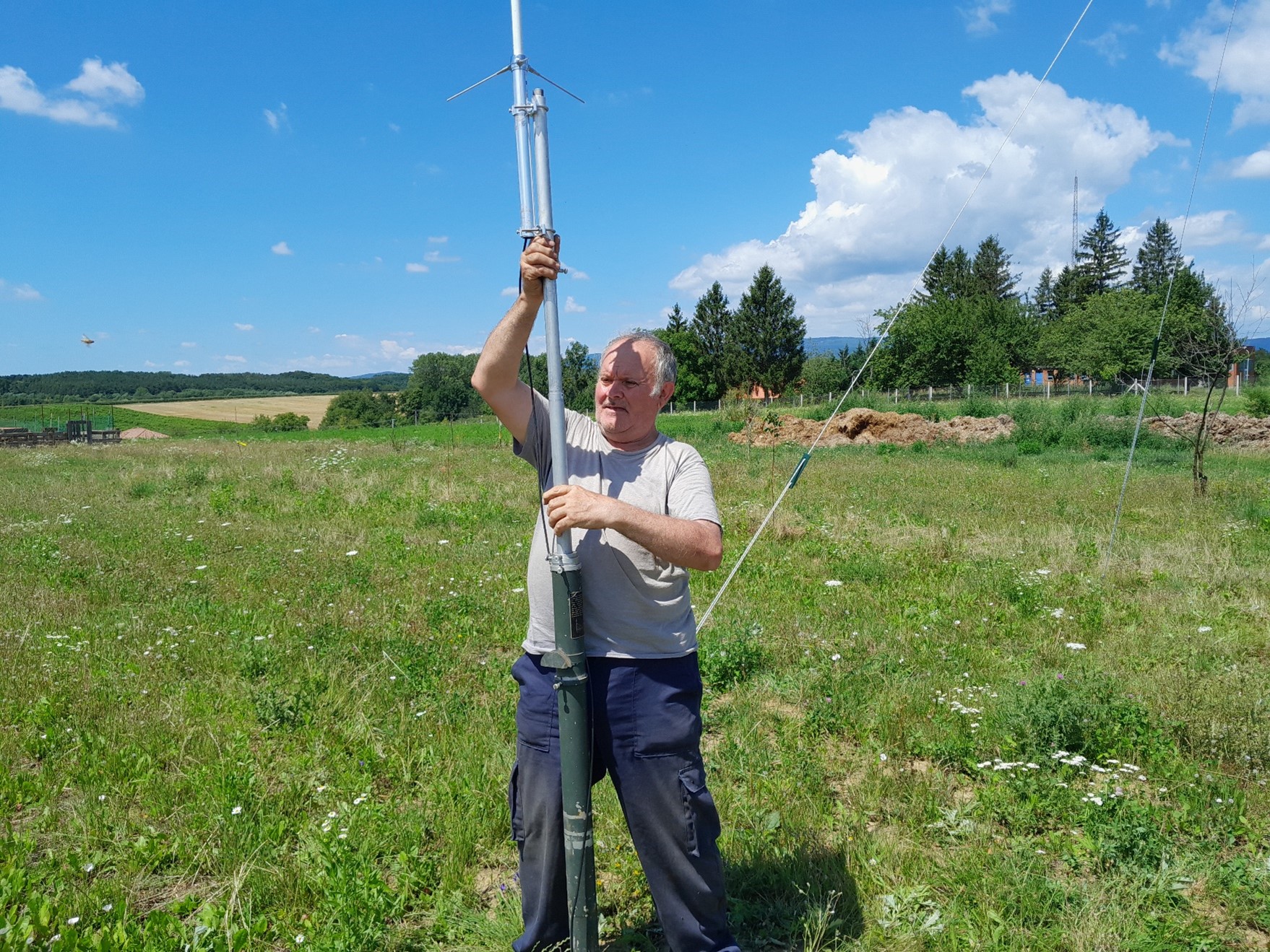 Feri hozott három árbócot, egyet használtunk a rövidhullámú antennám végéhez, egy teleszkópos árbóca 10 méterre kihúzható volt, arra váltakozva helyezte az URH antennákat, mert kísérleteket és összehasonlításokat is végzett a különböző jeladók vételi lehetőségeiben, valamint egy saját gyártmányú, ötletesen kivitelezett árbóc, aminek a talpa egy mosógép nagyméretű kerek dobtartója volt.
